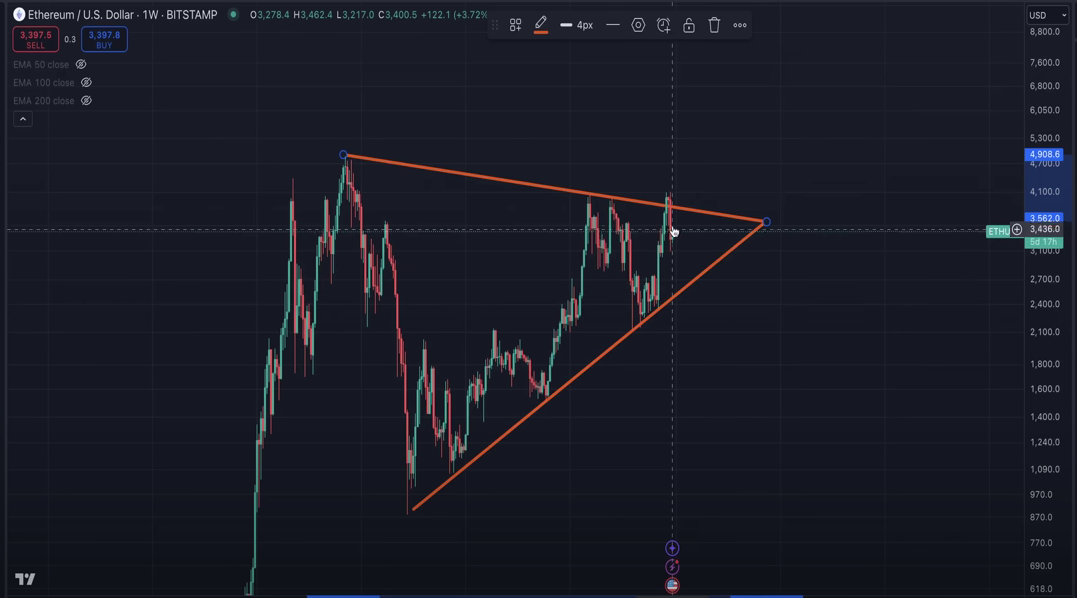 Recent price activity on Ethereum has been volatile, with a sharp drop from $4,101 to $3,100. Still, Davis is upbeat, pointing to Ethereum’s triangle of consolidation as a forerunner of a breakout.