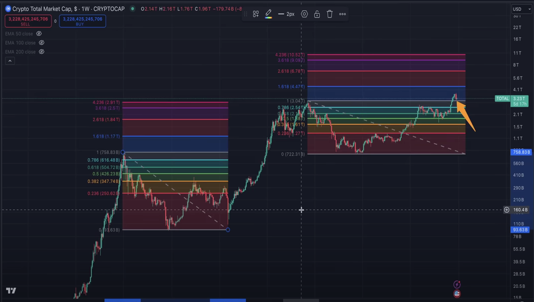 - Fibonacci tools suggest potential cycle peaks for Bitcoin, Ethereum, and the total cryptocurrency market in 2025.