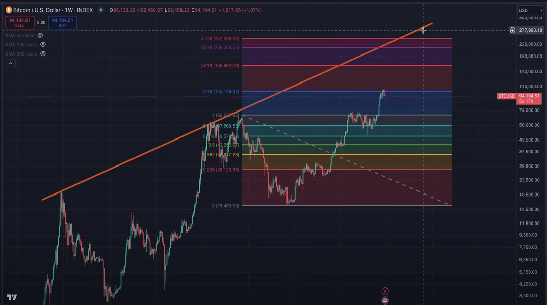 Lark is Davis starts by stressing the several ways Bitcoin’s price path could turn out. He projects a possible market top around March, April, or later in 2025 using tools including the Pi Cycle and Fibonacci extensions.