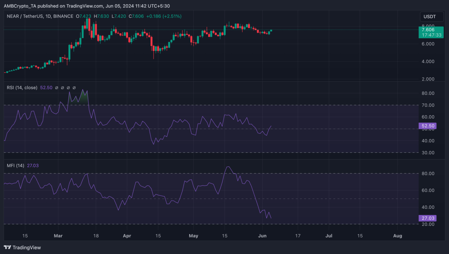 For example, NEAR’s Relative Strength Index (RSI) was 52.29, and its Money Flow Index (MFI) was 26.96. These combined readings suggest that while market sentiment remains mostly neutral, there has been a significant outflow of money from the NEAR market. This points to the possibility of NEAR losing its recent gains as selling pressure builds.