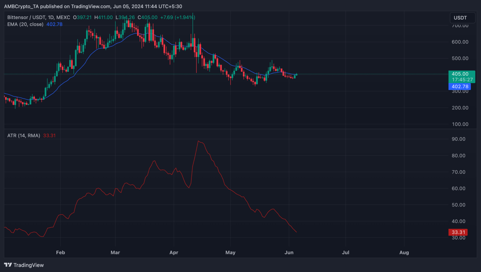 Similarly, TAO’s performance showed that its price trading was close to its 20-day exponential moving average (EMA). When an asset’s price hovers near this key moving average, it suggests market consolidation with the price lingering within a range. This was further confirmed by TAO’s declining Average True Range (ATR), an indicator of market volatility.