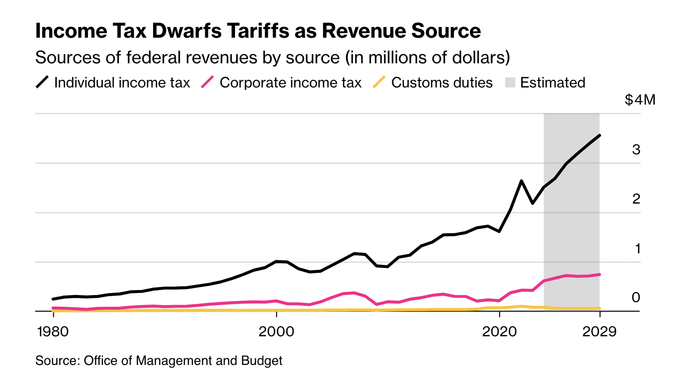 Trump’s proposal has its challenges. For one, income tax accounts for a significantly higher chunk of federal income than tariffs, as illustrated by the graph below from the Office of Management and Budget. For tariffs to match the income tax, they would have to be hiked drastically.