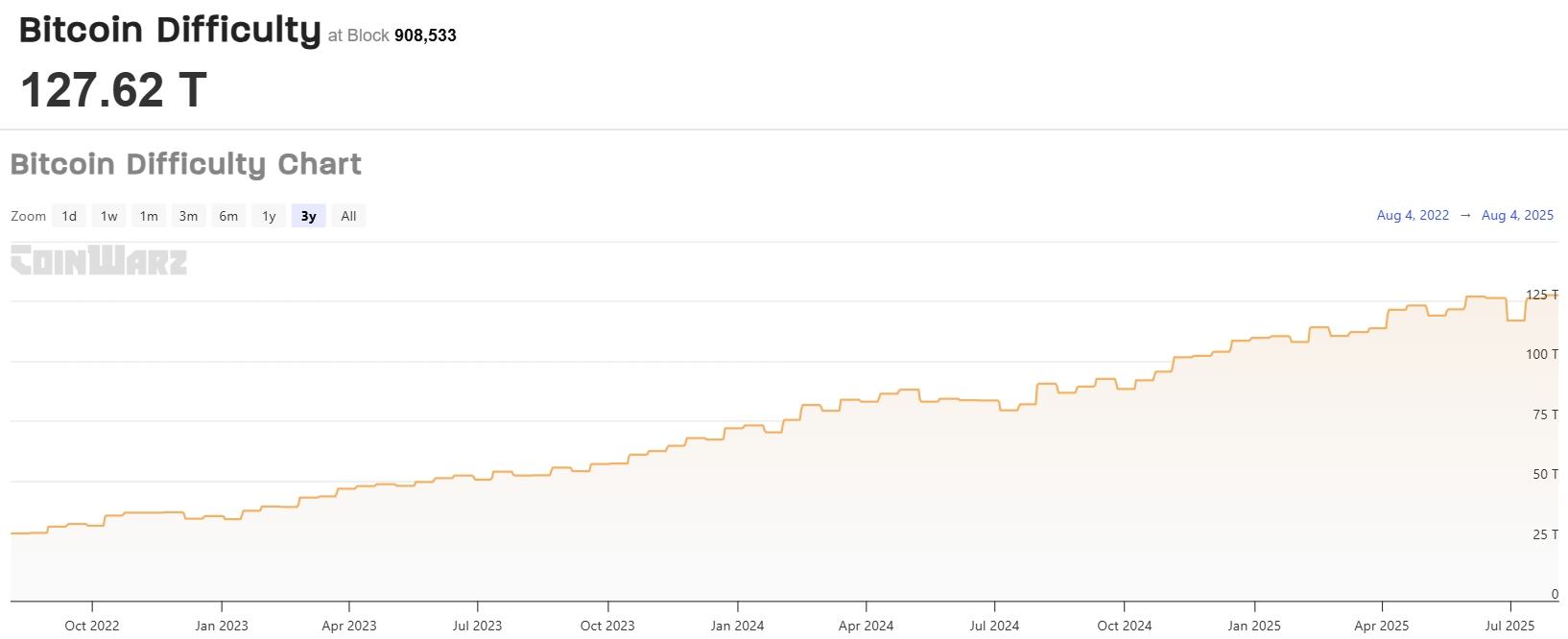 According to CoinWars, as of early August 2025, Bitcoin mining difficulty jumped to 127.62 trillion. This is the highest number in Bitcoin’s history. So, is it getting harder to find a block? Yes, and that’s not without consequences.