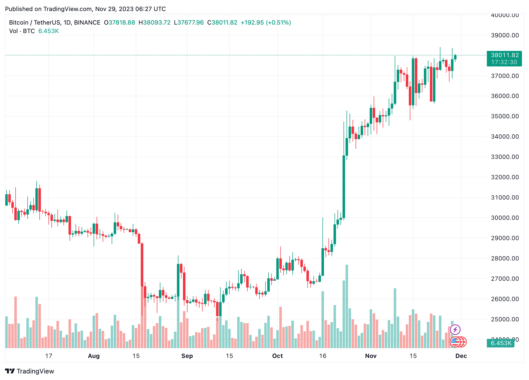 Below, you’ll find the BTCUSDT chart, illustrating Bitcoin’s significant milestone as it has reclaimed the $38,000 mark.