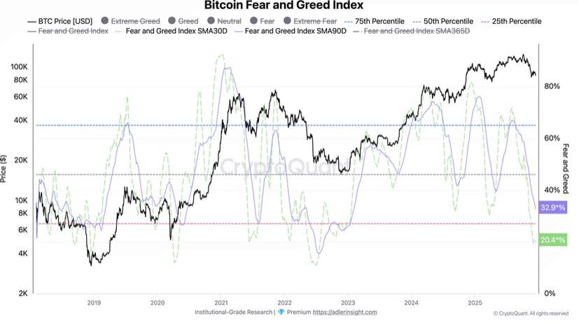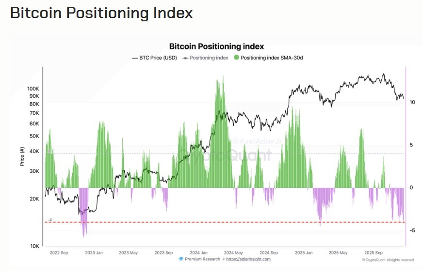 Laut dem On-Chain Analyst Axel Adler liegt die Hauptursache vor allem im Derivatemarkt. Der Futures-Markt wird klar durch bärischen Druck getrieben. Zwei zentrale Indikatoren liefern dafür konsistente Signale: Der Bitcoin Position Index als auch der Fear-and-Greed-Index.