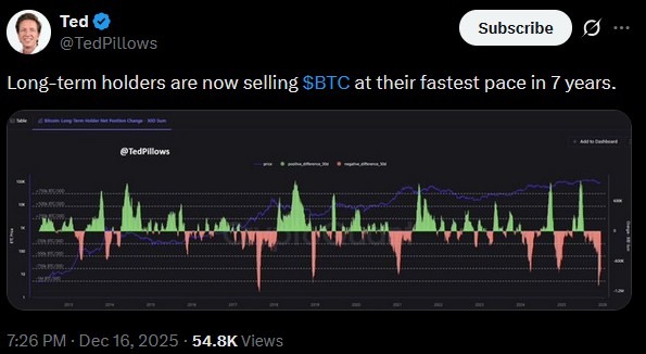 Laut Analyst Ted verkaufen derzeit langfristige BTC-Hodler ihre Bestände so schnell wie zuletzt vor 7 Jahren. Eine solche Entwicklung ist oft am Ende eines bullischen Zykluses zu beobachten, da dann auch die Diamoand Hands Gewinne realisieren und damit in Folge ein starker Verkaufsdruck entsteht.
