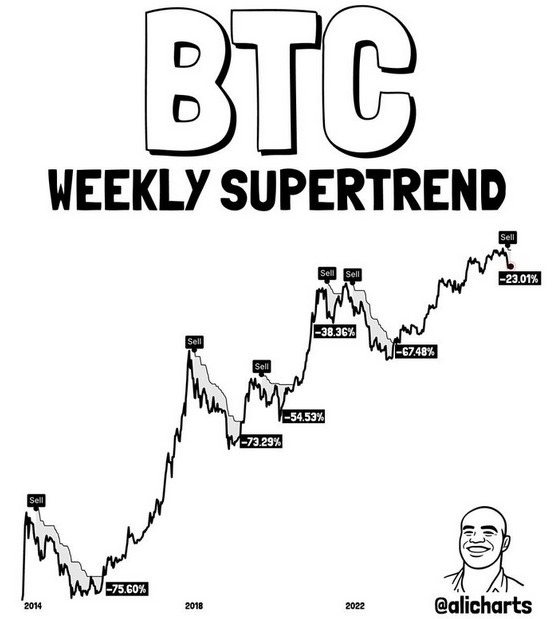 Der technische Analyst Ali Charts warnt vor einem möglichen starken Rückgang bei Bitcoin, da der SuperTrend-Indikator auf dem Wochenchart kürzlich ein Verkaufssignal („Sell“) ausgelöst hat. Historisch folgten auf solche Signale massive Korrekturen, darunter Rückgänge von bis zu 75 % in früheren Zyklen wie 2014, 2018 und 2022.