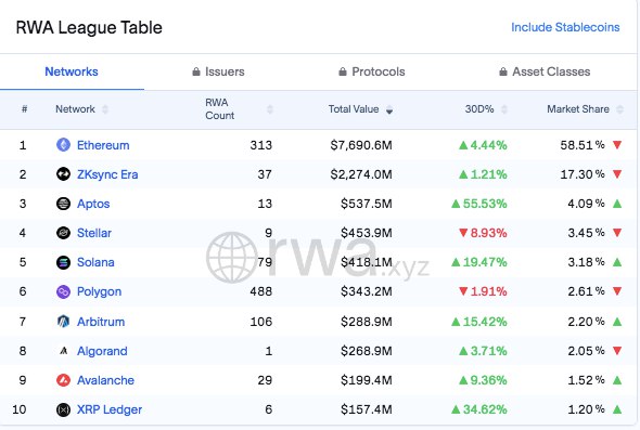 Ethereum bleibt das dominierende Netzwerk für tokenisierte Real-World-Assets mit einem Wert von 7,69 Milliarden US-Dollar oder 58,51 % des gesamten RWA-Marktes. ZKSync folgt mit 2,27 Milliarden US-Dollar, was 17,30 % des Marktes entspricht. Aptos hat sich mit einem Marktanteil von 4,09 % als starker Dritter herauskristallisiert und übertrifft Stellar mit 453,9 Mio. $.
