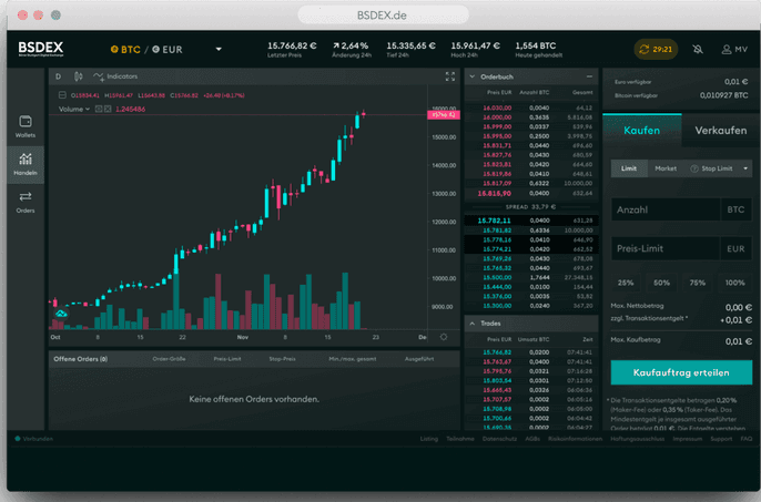 Größere Börsen bieten sowohl einfache Kaufoptionen für Anfänger als auch professionelle Handelsoberflächen mit Orderbuch und Charts. Du kannst mit wenigen Klicks kaufen oder – wenn du fit bist – alle Trading-Tools nutzen.