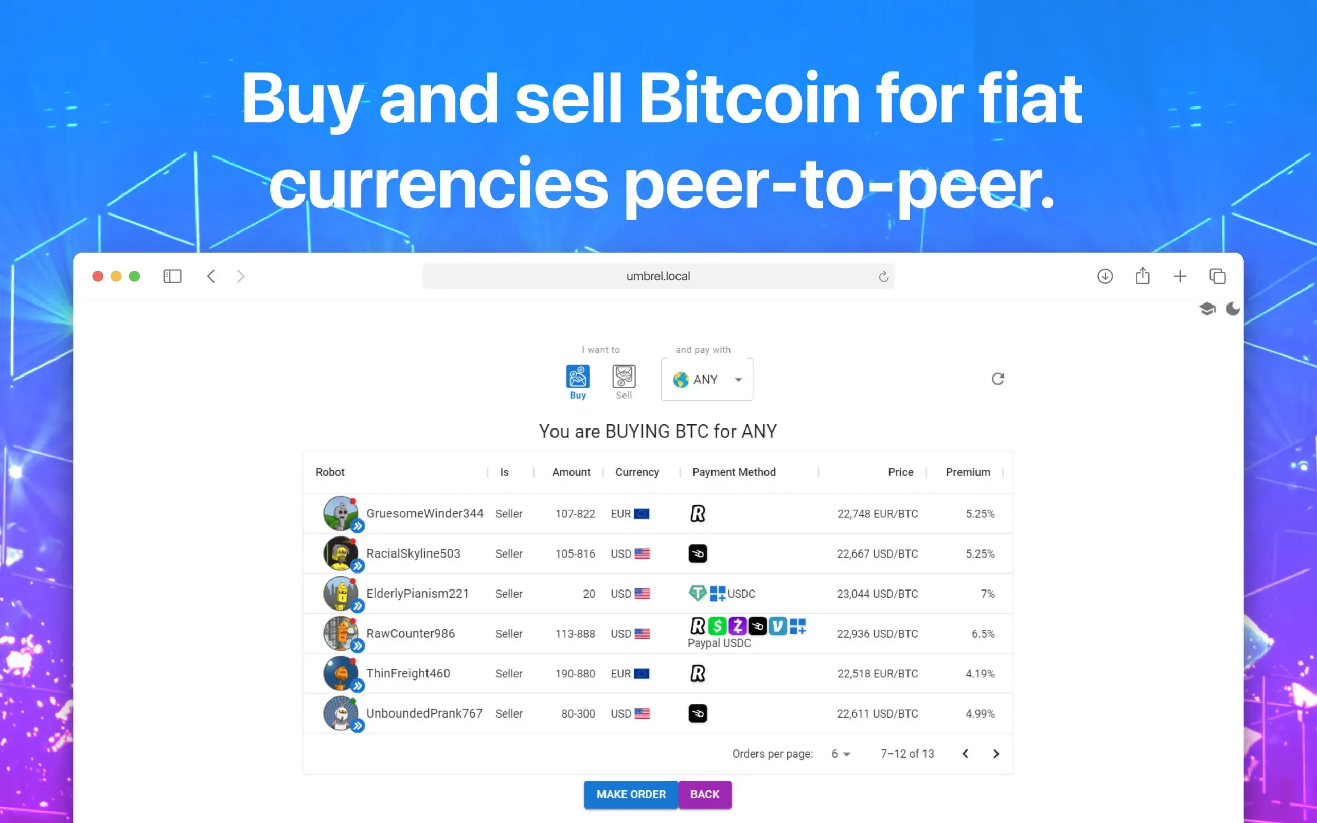 | RoboSats | P2P (Lightning) | Bitcoin gegen Fiat (Lightning) | Über Tor, Lightning escrow |