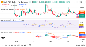 Trotz des starken institutionellen Vorstoßes bleibt die Kursentwicklung von BONK gedämpft. Der aktuelle Kurs von BONK liegt bei $0,000001. Er bleibt zwischen 0,000001 und 0,000002 Dollar, ein starkes Indiz, dass der Token in eine Konsolidierungsphase eingetreten ist.