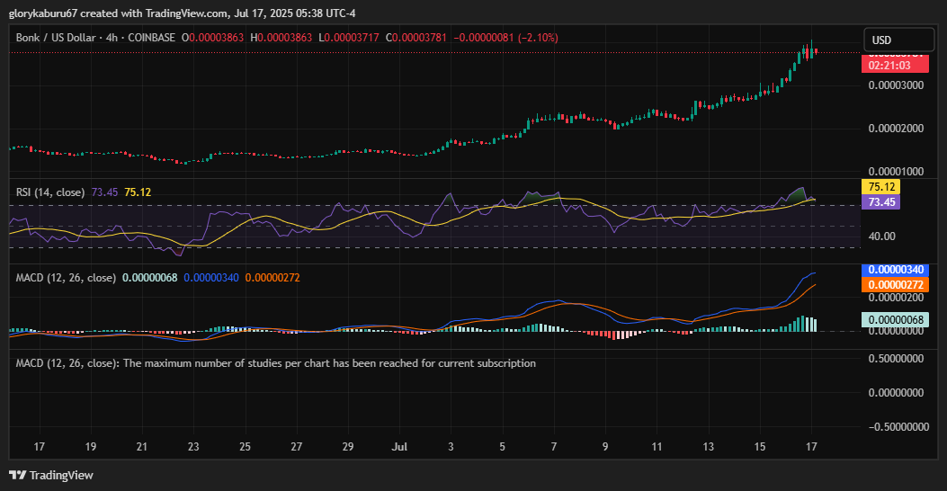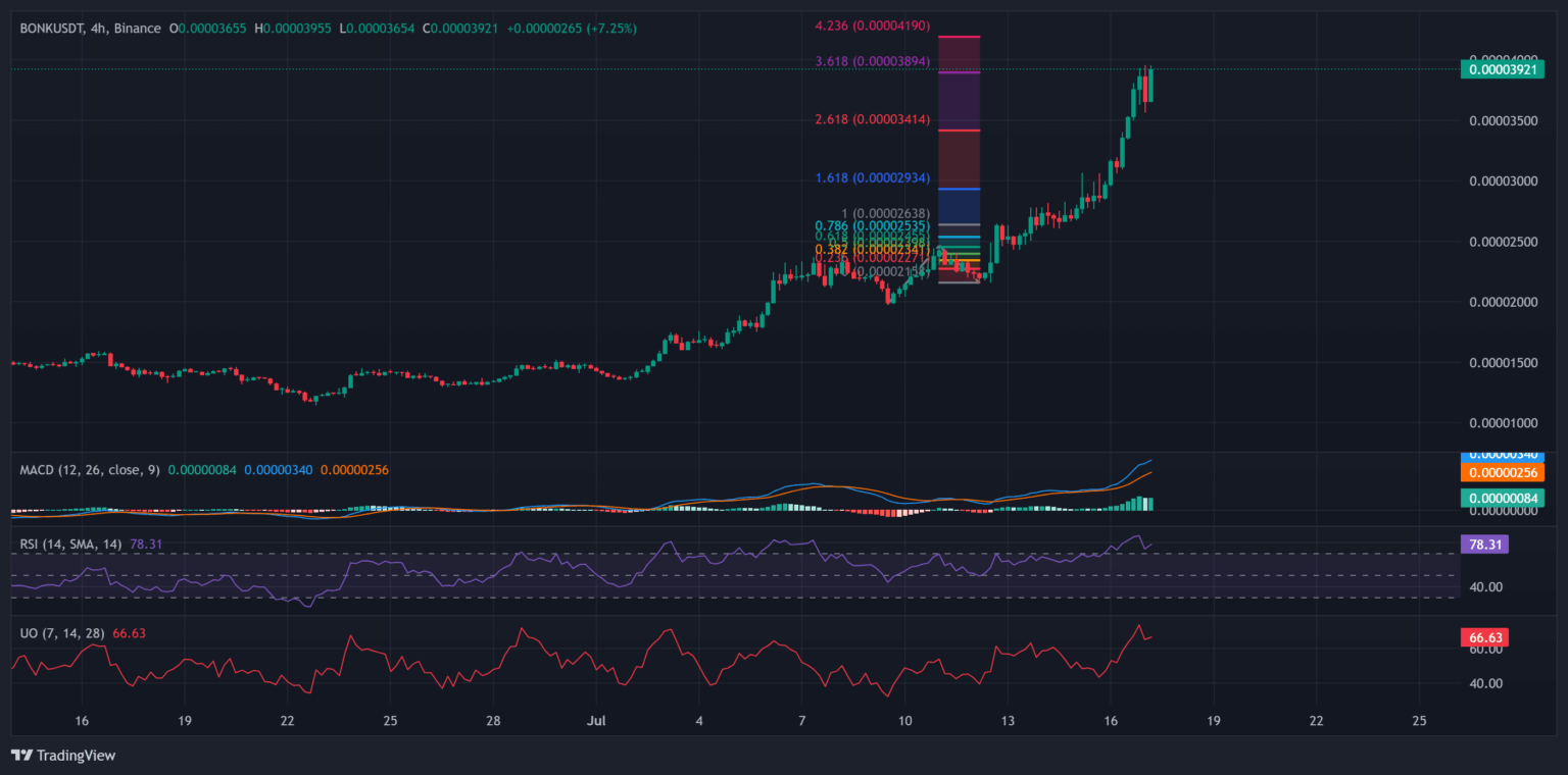 Wie CNF berichtete, hat BONK in den letzten zwei Wochen um über 185% zugelegt und ist von 0,00001368 am 2. Juli auf ein Hoch von 0,00003898 Dollargestiegen. Laut TradingView bewegt sich der Kurs derzeit zwischen 0,000033 und 0,000039 Dollar.