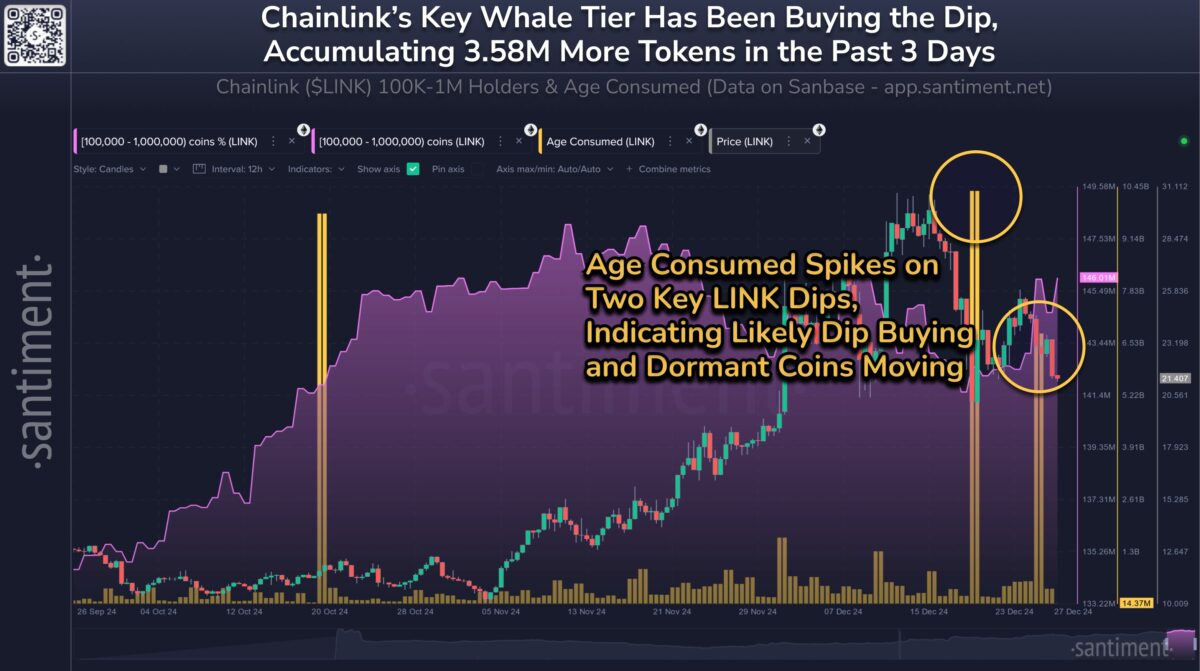 Nach einer starken Ablehnung bei 30 $ Mitte Dezember musste der Chainlink-Kurs eine starke Korrektur von rund 27 % hinnehmen und wird derzeit nahe der Unterstützung bei 21,50 $ gehandelt. Trotz dieses Rückgangs haben die LINK-Wale die Dips in einer massiven Akkumulation gekauft.