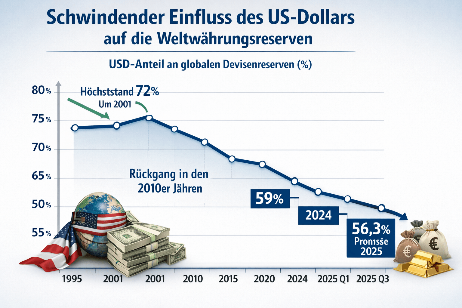 Die Veröffentlichung des Internationalen Währungsfonds (IWF) zur Währungszusammensetzung der offiziellen Devisenreserven (COFER) zum Jahresende 2025 zeigt kontinuierliche Langzeittrends. Der Anteil des US‑Dollars an den Weltwährungsreserven sinkt. Gleichzeitig gewinnen besonders der Euro und der chinesische Renminbi und sogar Währungen kleinerer Industriestaaten an Bedeutung.