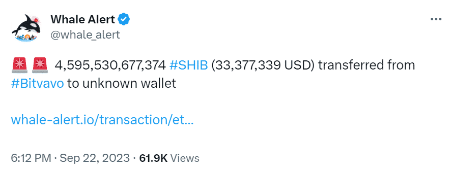 Jüngste Daten von IntoTheBlock zeigen einen deutlichen Anstieg der Wal-Transaktionen, insbesondere am 21. September, als deren Gesamtwert 47 Millionen Dollar überstieg. Die erhöhte Wal-Aktivität wurde auch von Whale Alert bestätigt, einem prominenten Krypto-Transaktionstracker, der einen erheblichen SHIB-Transfer meldete, ausgehend von der in Amsterdam ansässigen Börse Bitvavo.