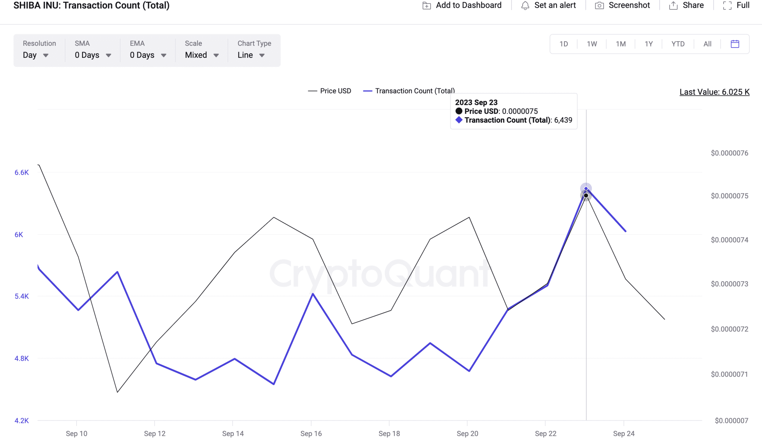 Wie in der untenstehenden Cryptoquant-Grafik dargestellt, verzeichnete das Shiba Inu-Netzwerk am 23. September einen Spitzenwert von 6.439 Transaktionen in zwei Wochen. Dies ist ein Anstieg um 36 % gegenüber den 4.749 Transaktionen vom 11. September, als der SHIB-Kurs seinen tiefsten Stand seit dem 14. Juni erreicht hatte.