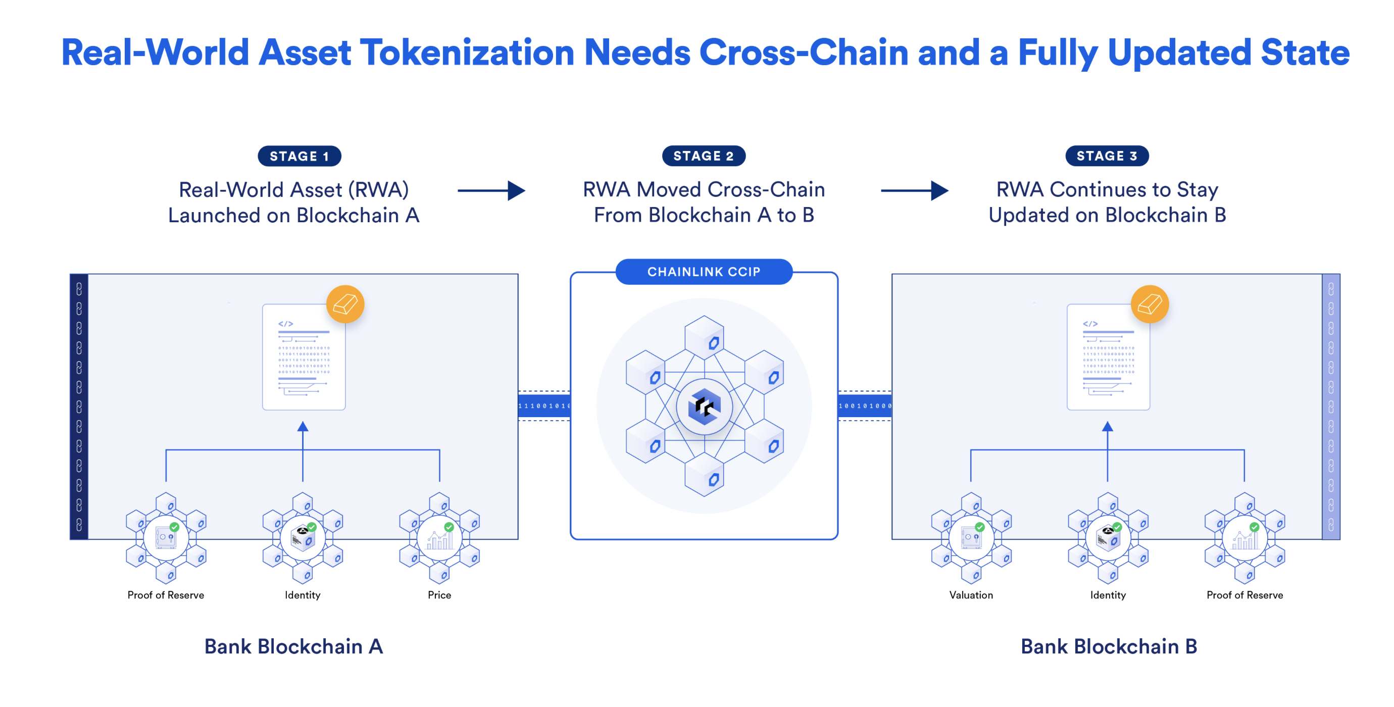 Chainlink destaca por su plataforma integral que proporciona servicios esenciales para la gestión de RWA tokenizados. Estos servicios incluyen la prueba de reserva, la verificación de identidad y varias fuentes de datos, lo que garantiza que los activos se enriquezcan continuamente con datos críticos del mundo real. Además, el Chainlink Cross-Chain Interoperability Protocol (CCIP) desempeña un papel crucial en la unificación de un ecosistema blockchain fragmentado, similar a TCP/IP, mejorando la liquidez y ampliando el acceso al mercado. véase la figura esquemática a continuación.