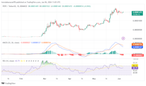 Si PEPE se embarca en otro rally en junio de 2024, como se prevé, el actual máximo histórico de 0,000017 dólares será el principal nivel de resistencia a corto plazo a superar.