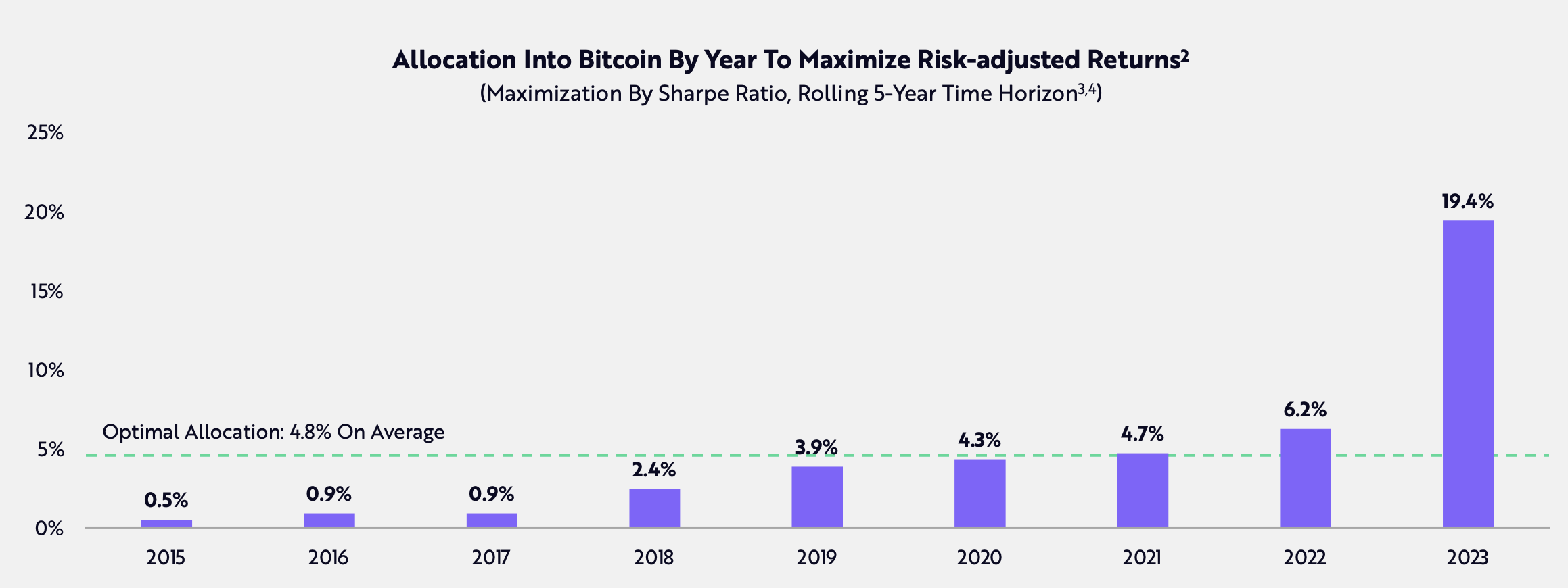 Los informes anuales de Ark se han vuelto cada vez más alcistas con Bitcoin, y en el último, la asignación recomendada es de una quinta parte de la cartera. Esto supone triplicar la recomendación del año pasado de sólo el 6,2%. Antes de eso, nunca había superado el 5%.