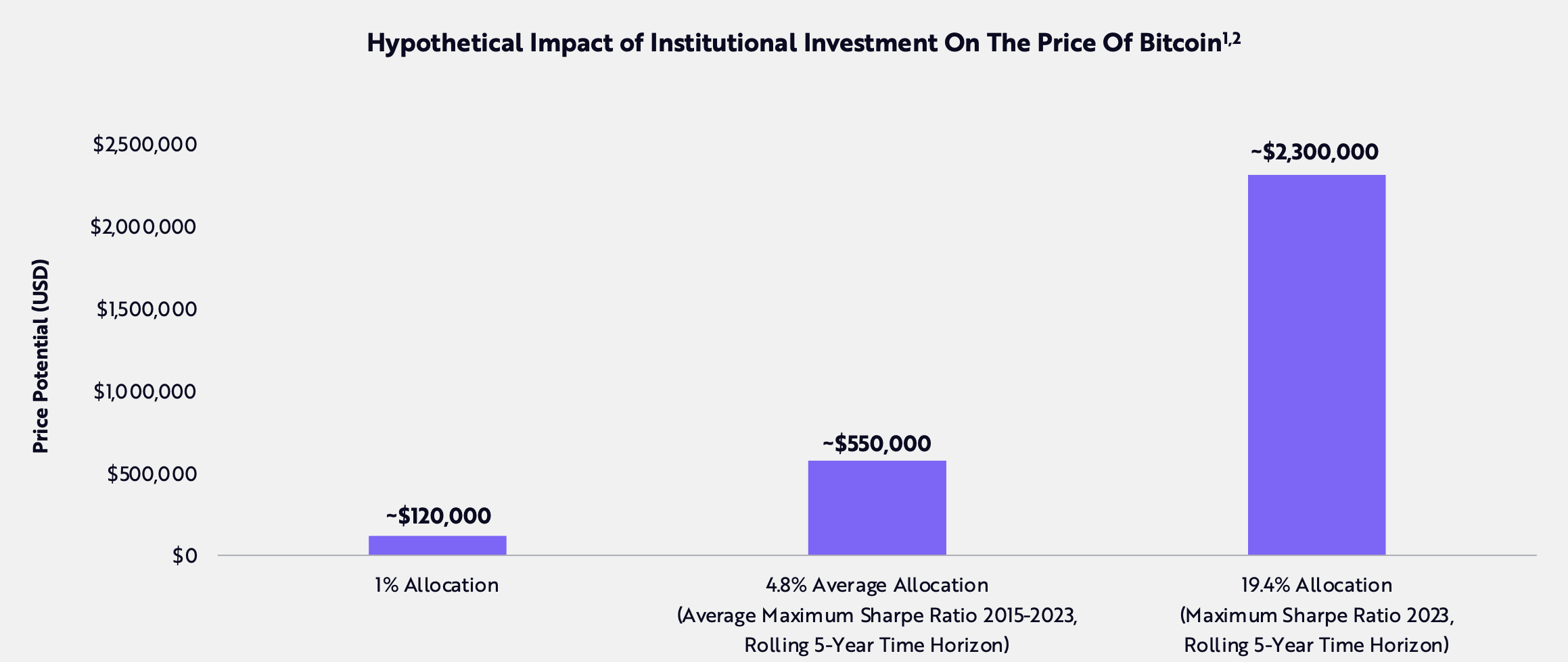 Desde que comenzó a publicar su informe anual, su asignación óptima media se ha situado en el 4,8%. Esta asignación podría llevar al Bitcoin hasta los $550.000. Su recomendación más reciente del 19,4% se traduciría en $48,5 billones fluyendo hacia Bitcoin, empujando a BTC a $2,3 millones, según la compañía.
