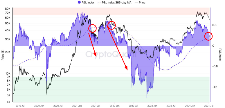 Según el informe de CryptoQuant, el índice de pérdidas y ganancias (P&L) se encuentra actualmente cerca de su media móvil (MA) de 365 días. El proveedor de datos en cadena sugiere que una caída por debajo de esta media podría señalar una corrección significativa para Bitcoin, similar a las caídas anteriores observadas en el mercado. Y añade: