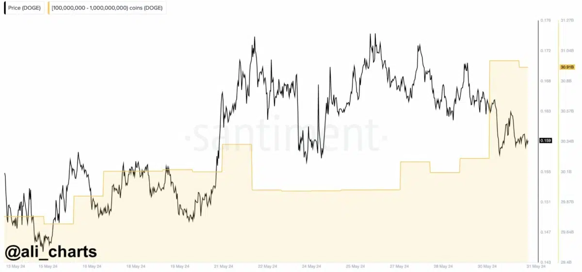 Vigilar a los grandes tenedores, o «ballenas», es crucial, ya que pueden influir significativamente en los precios. El 31 de mayo, las ballenas de Dogecoin compraron más de 700 millones de DOGE en 72 horas, por un total aproximado de 112 millones de dólares. Si este aumento en la actividad de las ballenas continúa, es más probable que el precio tienda al alza, informó Crypto News Flash.