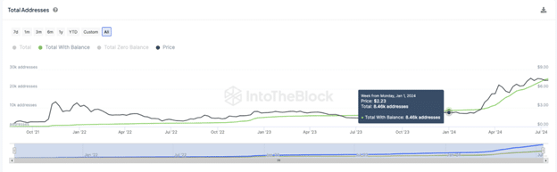 Una de las principales razones de la popularidad de Toncoin es el fuerte crecimiento de la base de usuarios registrado este año en 2024. El siguiente gráfico de IntoTheBlock muestra el crecimiento de la red de Toncoin mediante el seguimiento de los cambios en tiempo real en el número de direcciones de monedero financiadas activamente que poseen TON.