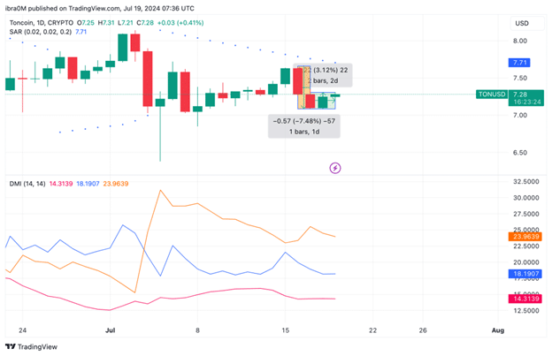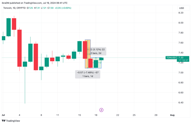 El siguiente gráfico ilustra cómo el precio de Toncoin retrocedió un 7,48%, cayendo a $7,09 el 17 de julio, después de alcanzar un máximo de $7,65 a principios de semana. En sólo 24 horas, los operadores alcistas intervinieron para evitar un cambio de tendencia bajista.