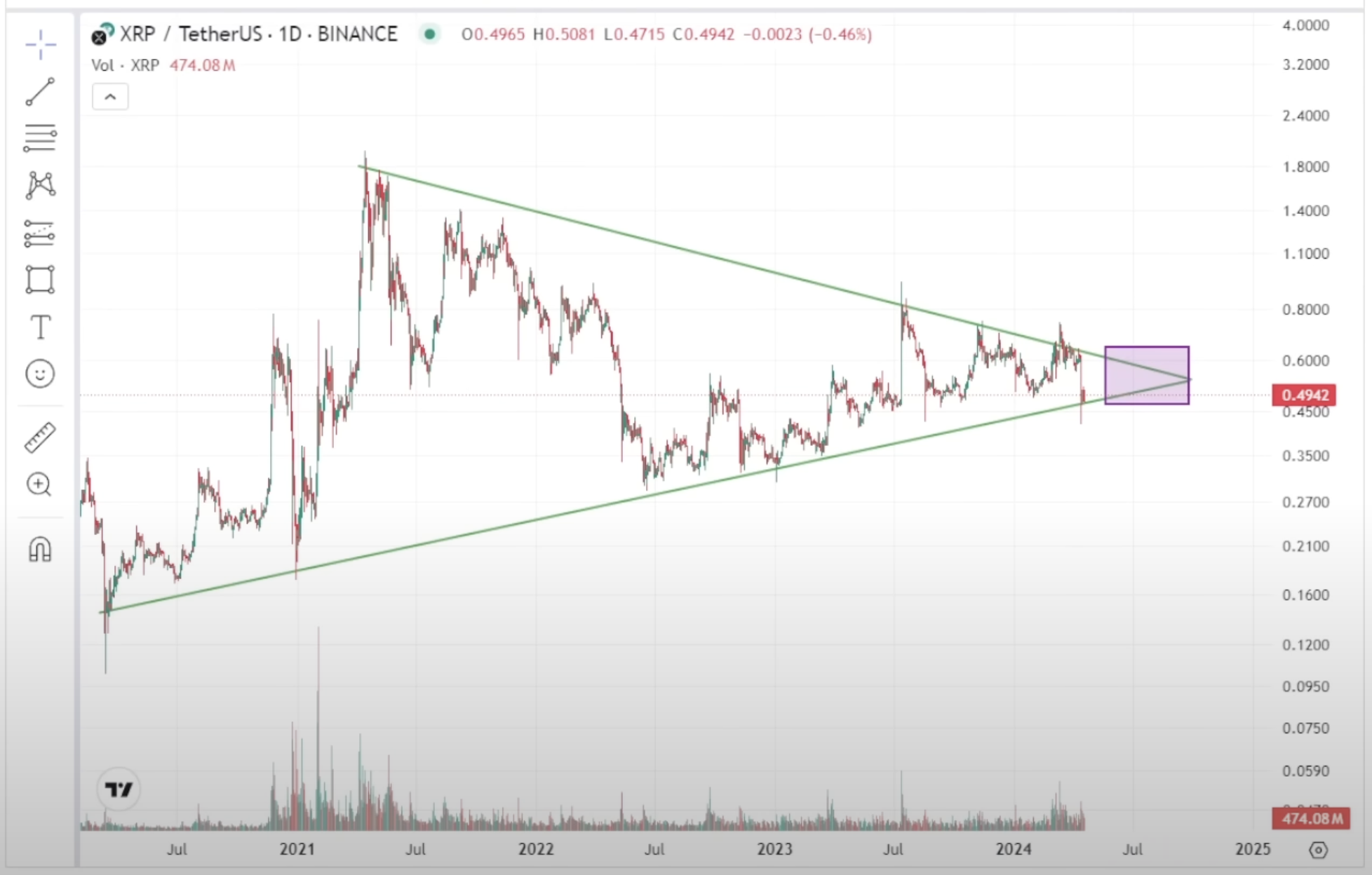 - XRP ha estado en un patrón de precios de consolidación durante tres años, y está listo para concluir en los próximos cuatro meses, estableciendo la moneda para ganancias masivas que podrían superar todos los registros anteriores.