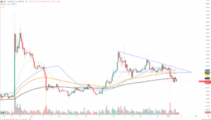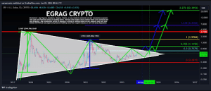 Elexamen de Egrag Crypto del gráfico de XRP/USD revela un patrón de triángulo simétrico, una formación a menudo asociada con un período de consolidación que precede a un cambio sustancial en el precio. El triángulo simétrico en el gráfico de precios de XRP desde principios de 2017 indica un rango de estrechamiento, insinuando una ruptura inminente. Este patrón capta la atención de operadores e inversores por igual, ya que sugiere que el precio del XRP puede estar preparándose para un movimiento digno de mención en breve.