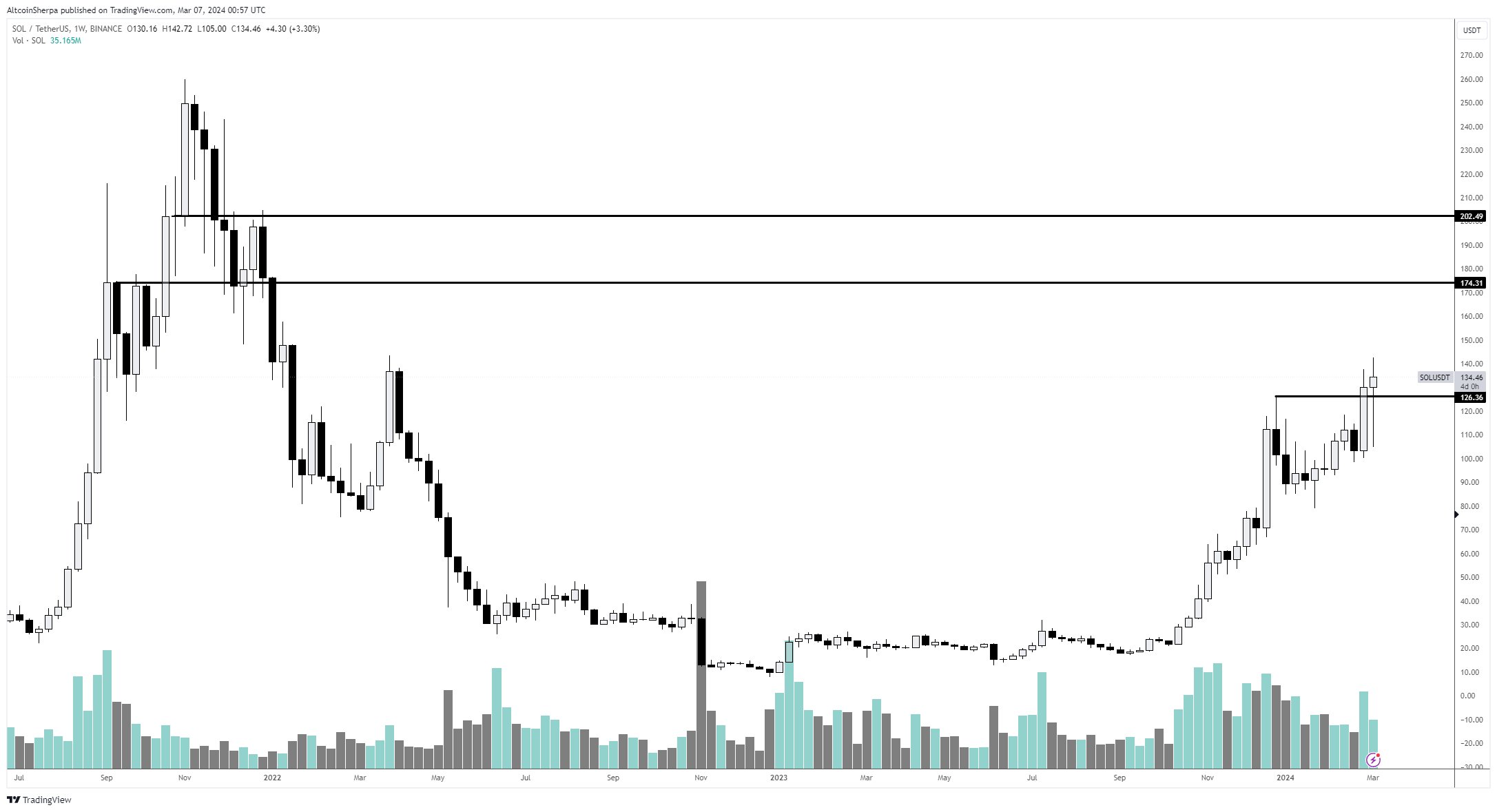 The analyst tells his 210,000 X followers that SOL’s next resistance levels are $174 and $202; if it surges past these, its next stop could be over $500. He stated: