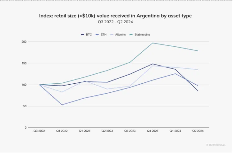 Les données de Chainalysis suggèrent que l’utilisation des stablecoins pour les petites transactions de détail augmente plus rapidement que tout autre type d’actif en Argentine, ce qui souligne leur rôle dans la stabilité financière.