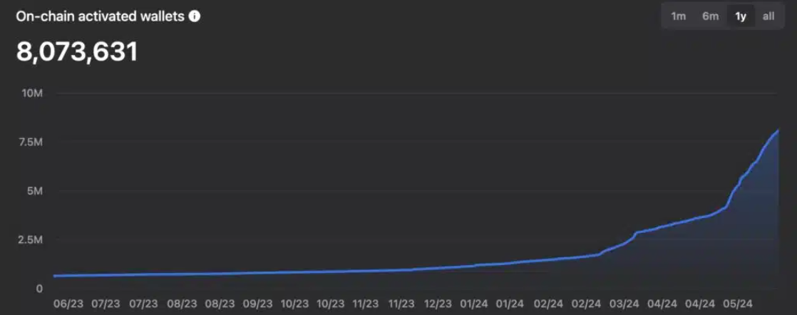 Le réseau de la blockchain Toncoin a fait preuve d’une croissance robuste, comme en témoigne le TVL sur le réseau, qui a approché le milliard de dollars. En outre, le nombre de portefeuilles actifs de Toncoin a augmenté de façon spectaculaire. De 1,28 million de portefeuilles actifs au début de l’année 2024, ce nombre est passé à plus de 8 millions. Cette croissance reflète l’élargissement de la base d’utilisateurs du réseau et l’adoption croissante du Toncoin pour diverses activités financières.