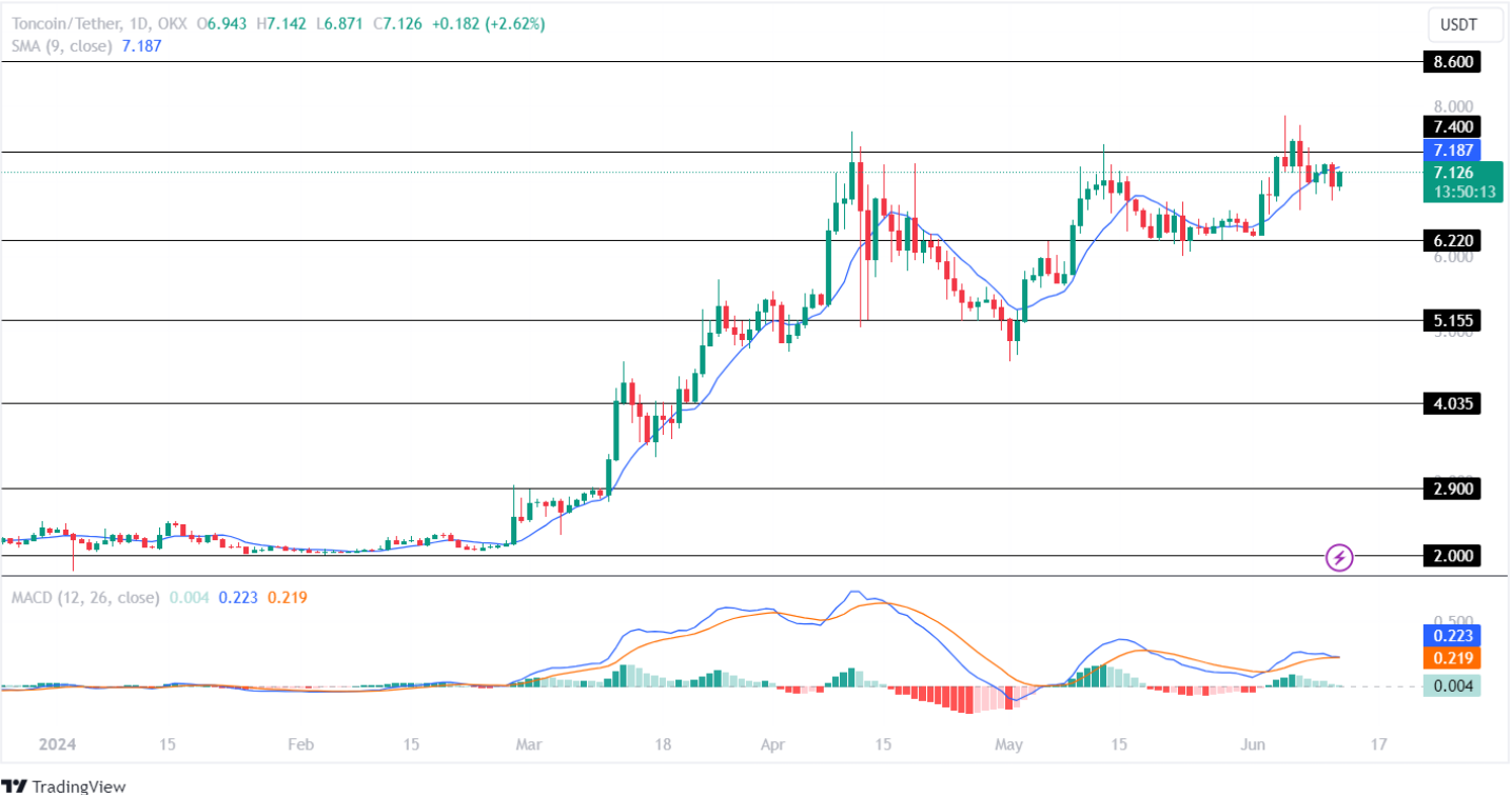 - Le prix du Toncoin a augmenté de 6,04 % en raison de la confiance accrue des investisseurs et des développements stratégiques au sein de The Open Network et de l’intégration de Telegram.