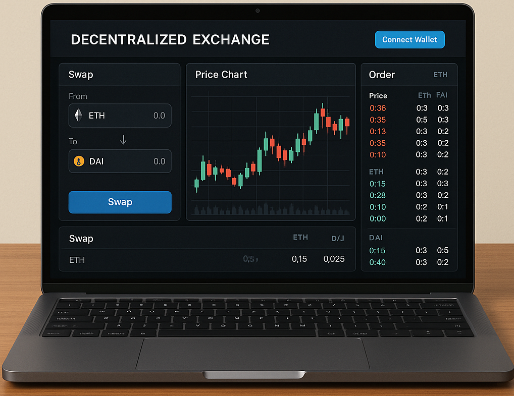 DeFi : Des protocoles comme Uniswap, Aave et MakerDAO permettent des échanges sans permission, le prêt et les stablecoins algorithmiques.