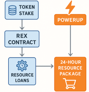 Le contrat Resource Exchange (REX) a été lancé en 2019 comme facilité de crédit automatisée, permettant aux détenteurs de louer leur CPU/NET aux dApps en échange de frais et de récompenses de vote. En 2021, le réseau a migré vers le modèle PowerUp, vendant des packs de ressources sur 24 h dont le prix est lié à la congestion du réseau via une équation utilitariste. Les deux mécanismes coexistent ; les gestionnaires sophistiqués arbitrent entre eux tandis que les utilisateurs occasionnels font confiance aux interfaces de portefeuille pour abstraire la complexité.
