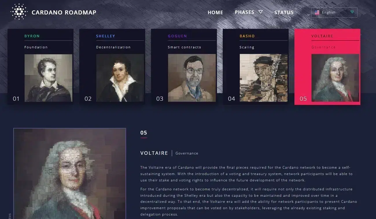 Era kelima dan terakhir adalah Voltaire, yang diambil dari nama filsuf dan penulis Prancis abad ke-18 yang terkenal. Era terakhir ini akan menyempurnakan semua fondasi teknis untuk membuat Cardano menjadi jaringan yang mandiri dengan diperkenalkannya sistem pemungutan suara dan perbendaharaan.
