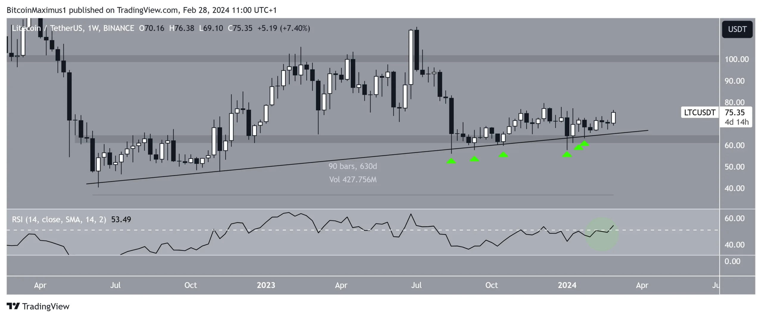 Litecoin’s next target price is $100, and, according to the triangular price pattern below, it could hit this landmark soon. The ascending trendline on the chart below has held for close to two years and indicates a continued pattern of higher lows for LTC, eventually pushing it past $100.