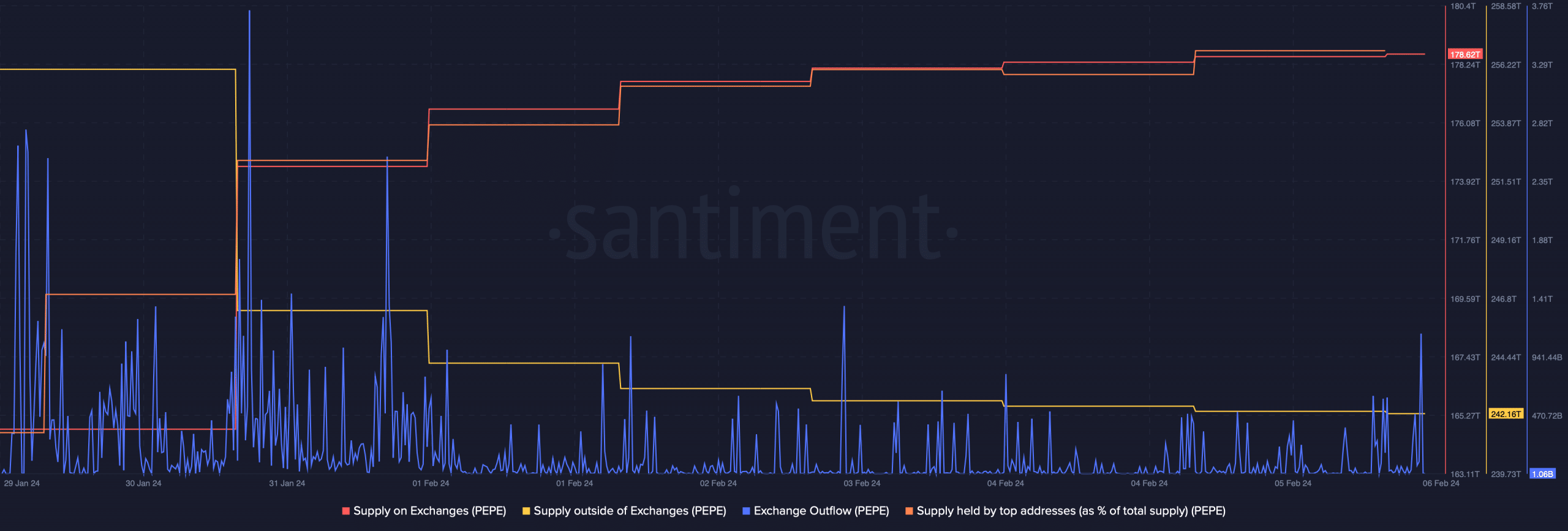Exchange inflow for the token continues to rise, indicating that investors are sending their tokens to exchanges to sell. Santiment data also shows that the concentration of PEPE outside of centralized exchanges has continued to dip.