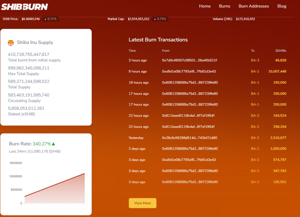 According to data from Shibburn, a tracking service that monitors Shiba Inu token burning, the SHIB burn rate surged by 340. 27%. In total, seven transactions and 11,080,178 tokens were burnt to reduce the overall supply. The largest burn was recorded at 10,007,448 tokens and happened around nine hours prior to the last update. The rest of the burns were of lesser quantities, the largest one being 258,204 tokens while the least being 45,839 tokens.