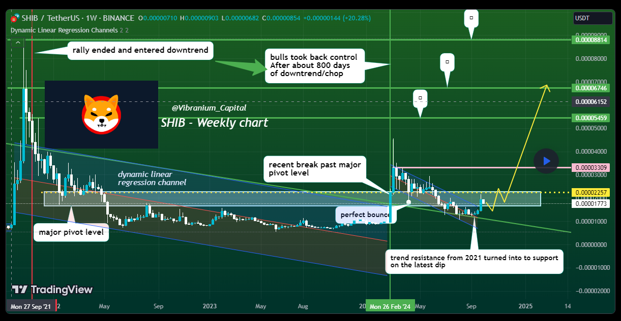 In a recent TradingView post, Vibranium Capital pointed to SHIB having fulfilled an 800-day downtrend. The trend resistance from 2021 is now flipping to become support, indicating a major technical breakdown.