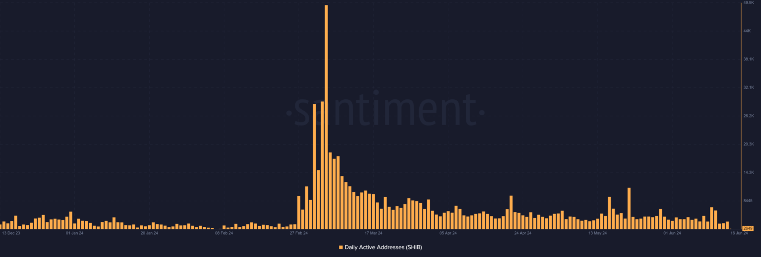 In addition to price movements, the activity on Shiba Inu’s network has shown a notable decline. Daily active addresses, a metric indicating the number of unique addresses involved in transactions on a given day, have decreased significantly. Data from Santiment reveals that active addresses dropped from a range of 6,000-7,000 in mid-June to approximately 2,500 currently. This decline suggests a reduction in network activity and user engagement, which is often a bearish signal for a cryptocurrency.