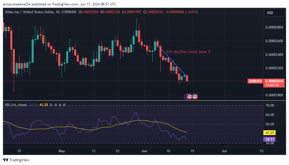 The cryptocurrency market has been closely monitoring Shiba Inu (SHIB) after a persistent downtrend that began on June 5. Shiba Inu experienced a 3.20% decline in the last 24 hours, trading around $0.00001998, offering a glimmer of hope for investors. Despite this pause, the overall outlook remains cautious as various metrics reveal the token’s current state.