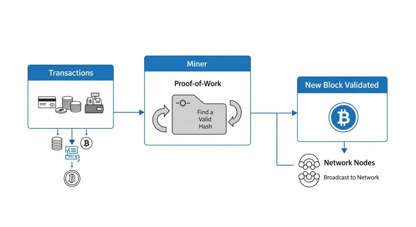| How a Block Is Mined | Miners gather transactions, build a block, and iterate a nonce until the block’s hash meets the network difficulty; the winning block is broadcast and validated by nodes. |