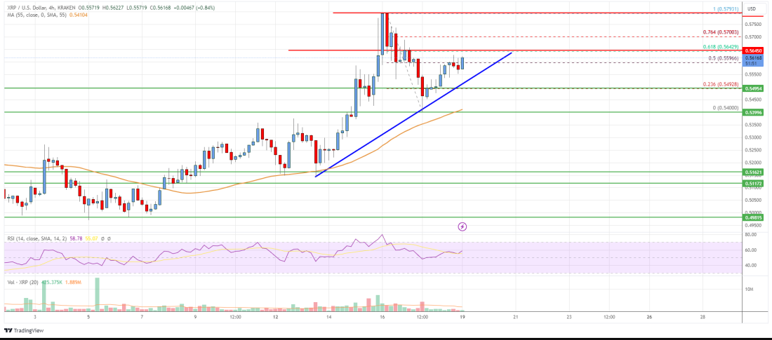 From a recent low near $0.5400, XRP has commenced a recovery, now trading above the $0.550 mark and maintaining a position above the 55 simple moving average on the 4-hour chart.Â