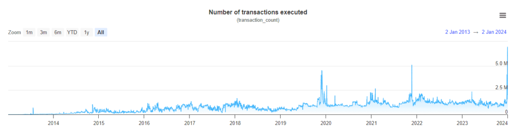 Analyzing on-chain metrics becomes crucial in assessing the potential future price volatility of XRP. According to xrpscan data, the number of executed XRP transactions reached an unprecedented peak, surpassing almost 7 million on December 31 and maintaining high levels at 6.9 million the following day.