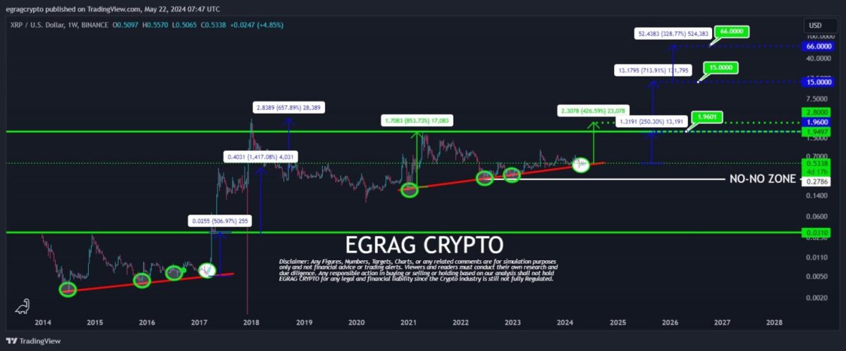 EGRAG CRYPTO’s methodology dissects past price surges into distinct periods, particularly those witnessed in 2017 and 2021. Notably, he divides the peak values of these periods in half, aiming to ascertain potential price targets for XRP in the current market cycle while maintaining a cautious outlook.