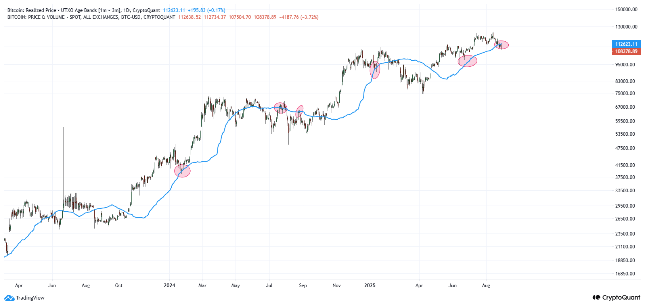 According to on-chain analyst CryptoOnchain, there are two key indicators currently being tested. First, the Short-Term Holder Realized Price (1–3 months), which is the average price paid by investors who have only held Bitcoin for between one and three months.