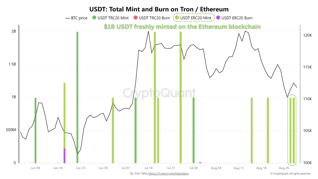 However, following this wave of selling pressure, signals emerged in the opposite direction. For two consecutive days, Tether minted $1 billion USDT on the Ethereum network.