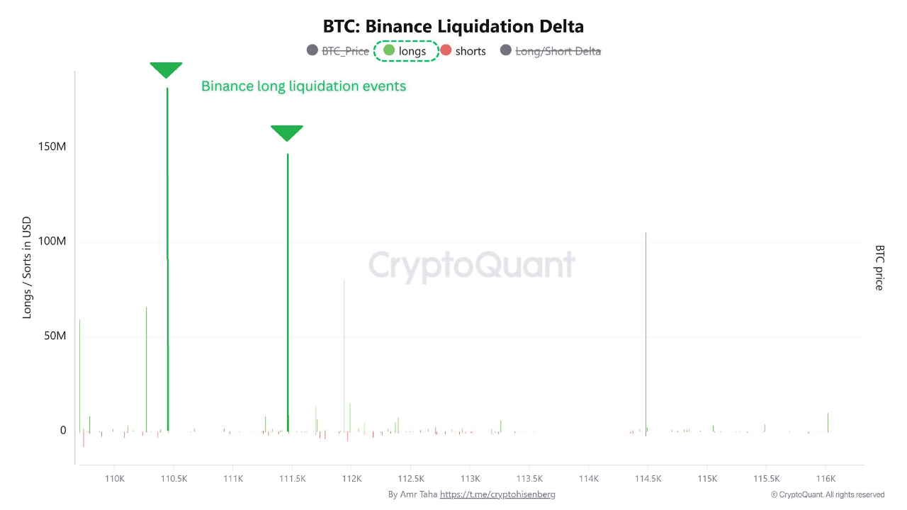 On-chain analyst Amr Taha on CryptoQuant explained that two waves of liquidations hit traders who entered late with high leverage. The price briefly fell to around $111,400 and then again to $110,400.